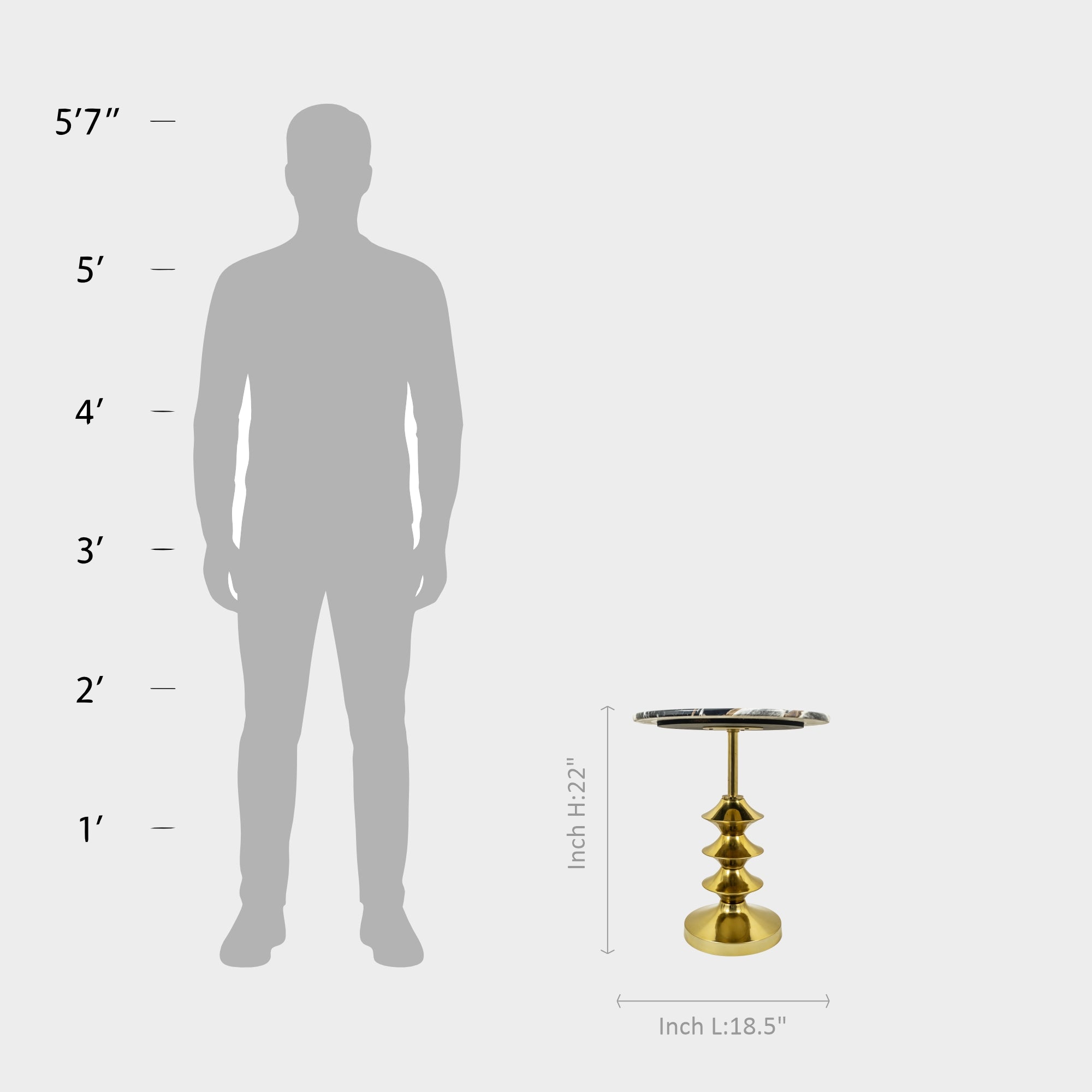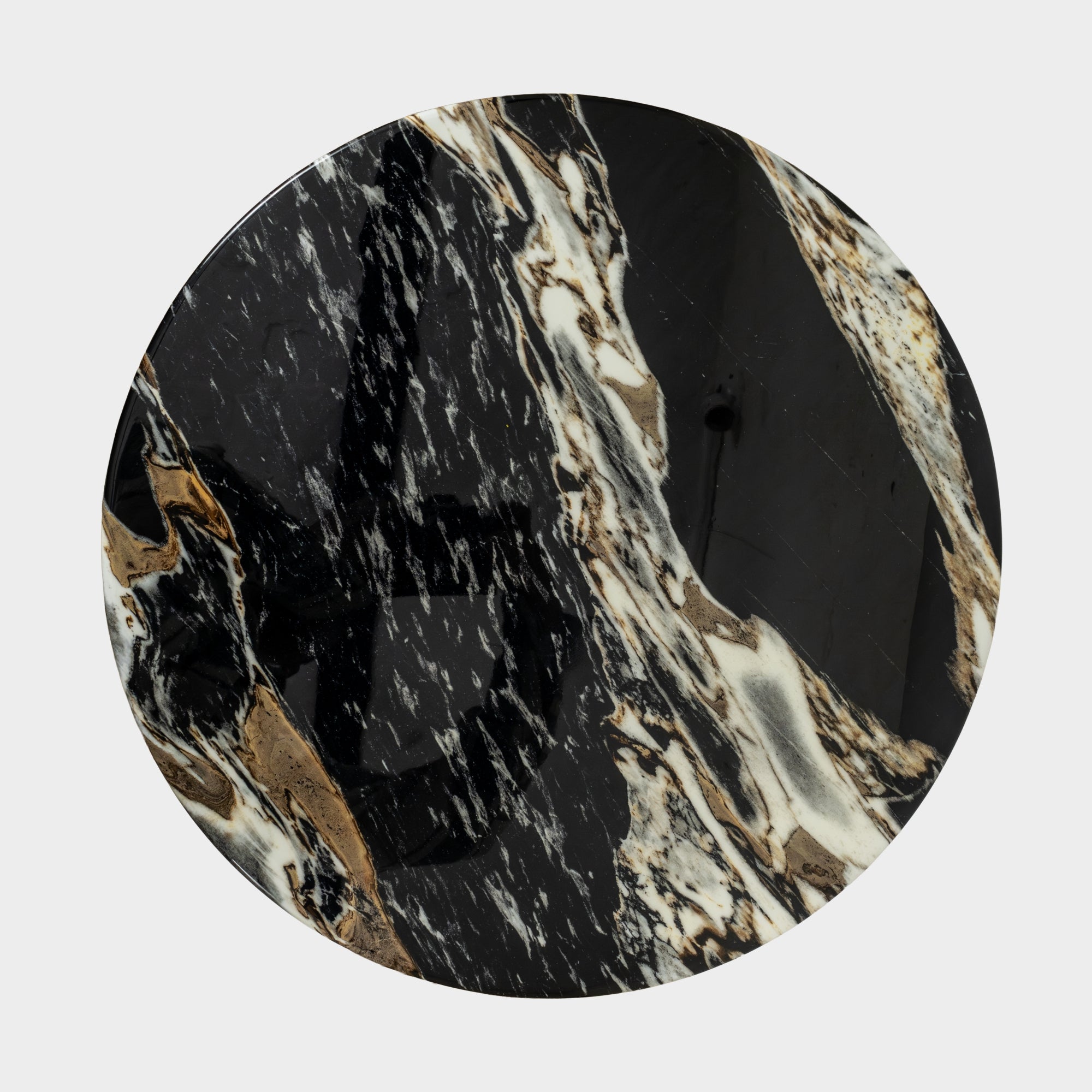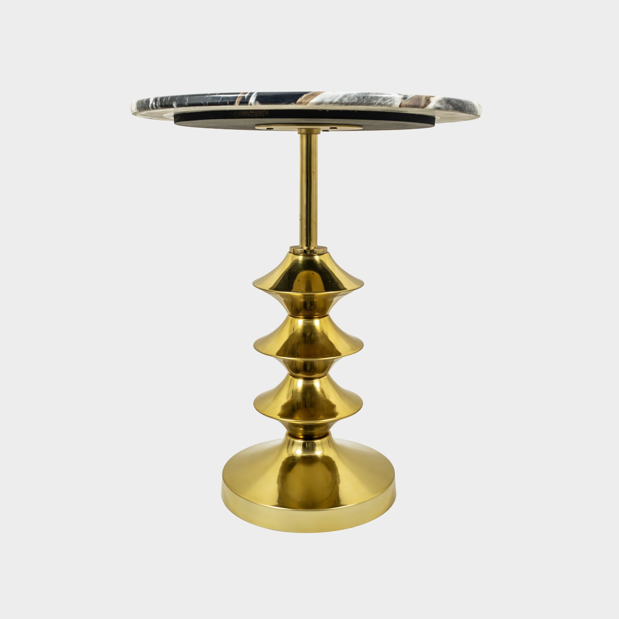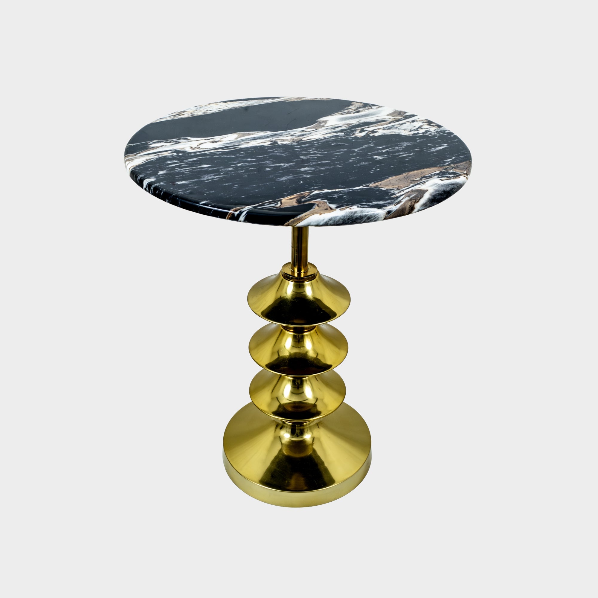 This coffee table features a round black marble top with natural white and brown patterns, giving it a rich and stylish look. The base is made of metal with a polished gold finish, shaped in a stacked design that makes the table stand out in any room.