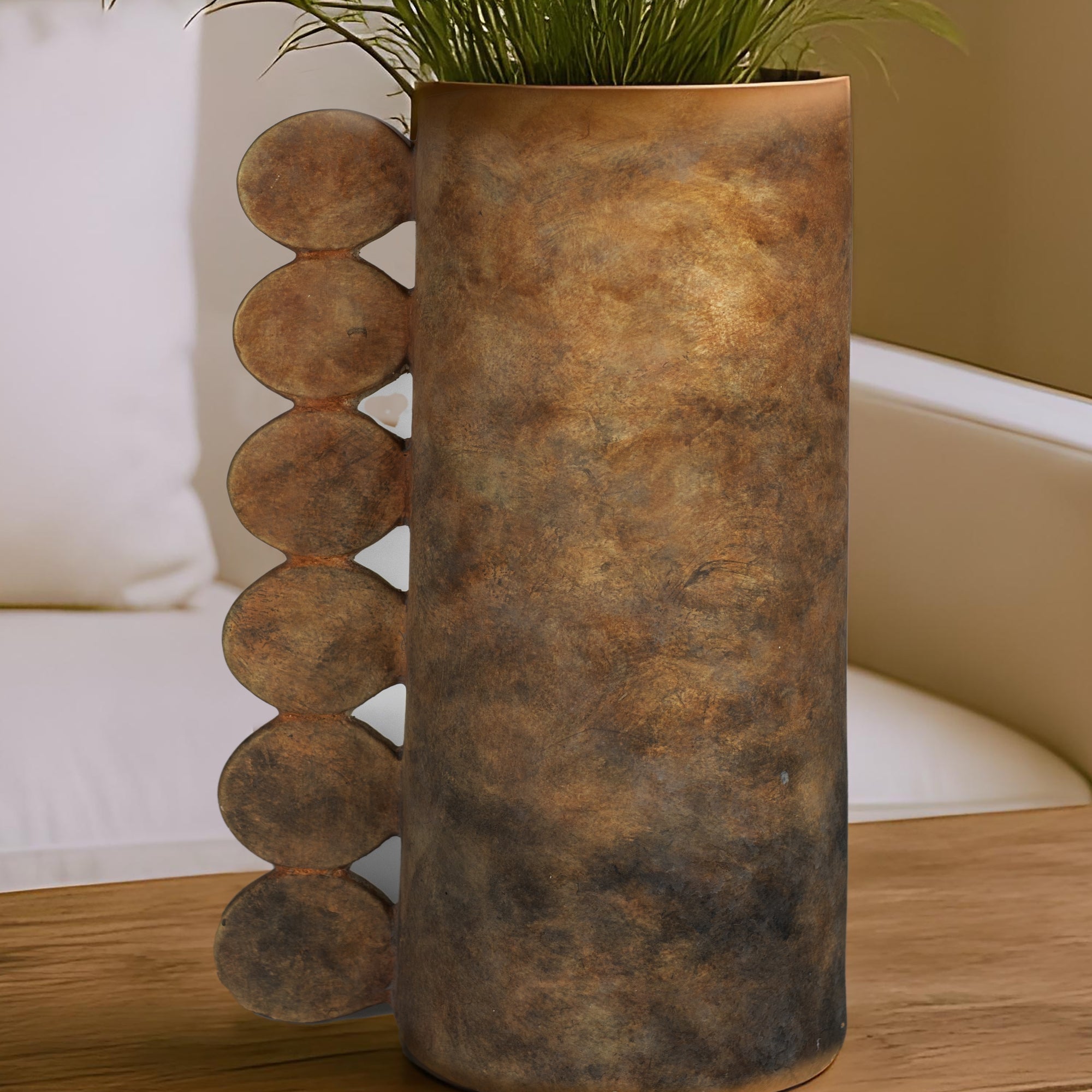 This ceramic vase features a smooth cylindrical shape with a unique design—six round discs attached to one side, giving it a modern and artistic look. The surface has a rich, textured finish with a blend of earthy brown, tan, and golden tones, creating a warm, natural feel.Its tall and slim...