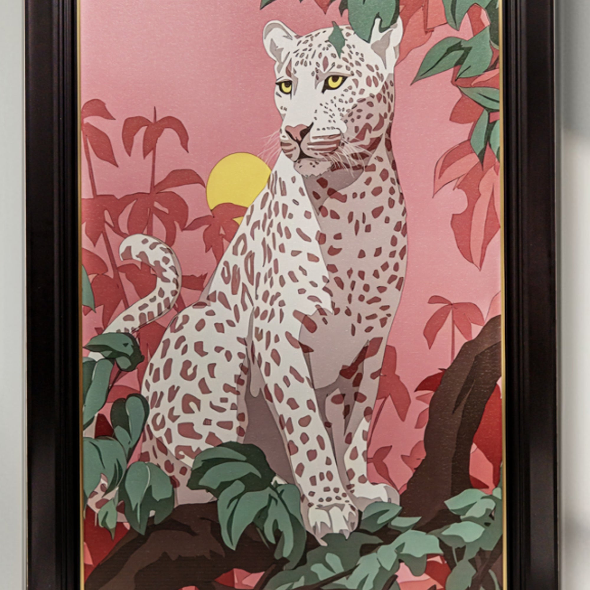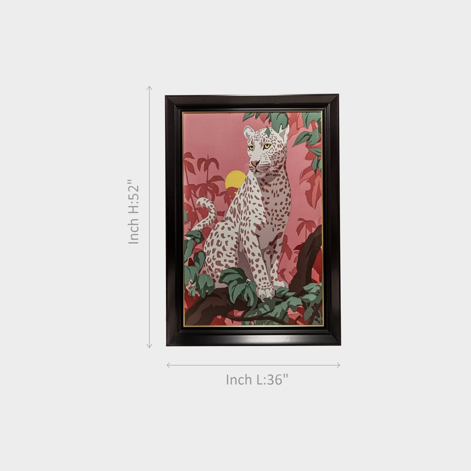 This stunning canvas art features a leopard resting on a tree amidst lush jungle scenery. With vibrant pinks, greenery, and a glowing sun, it blends digital print and hand-finished oil pastels for texture and depth. Finished with a dust-free coat and a dark frame with gold accents, it brings bold...
