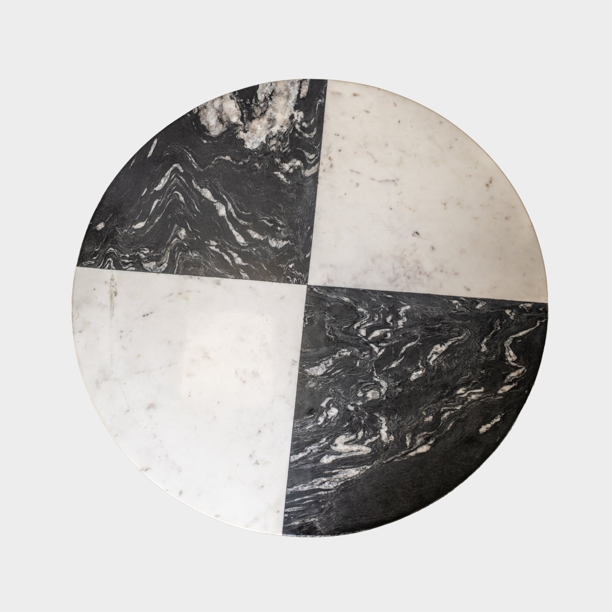 This side table features a round marble top paired with a sturdy metal base. The natural marble surface showcases unique patterns, making each piece slightly different. The solid metal base provides stability while giving the table a balanced and well-crafted structure.