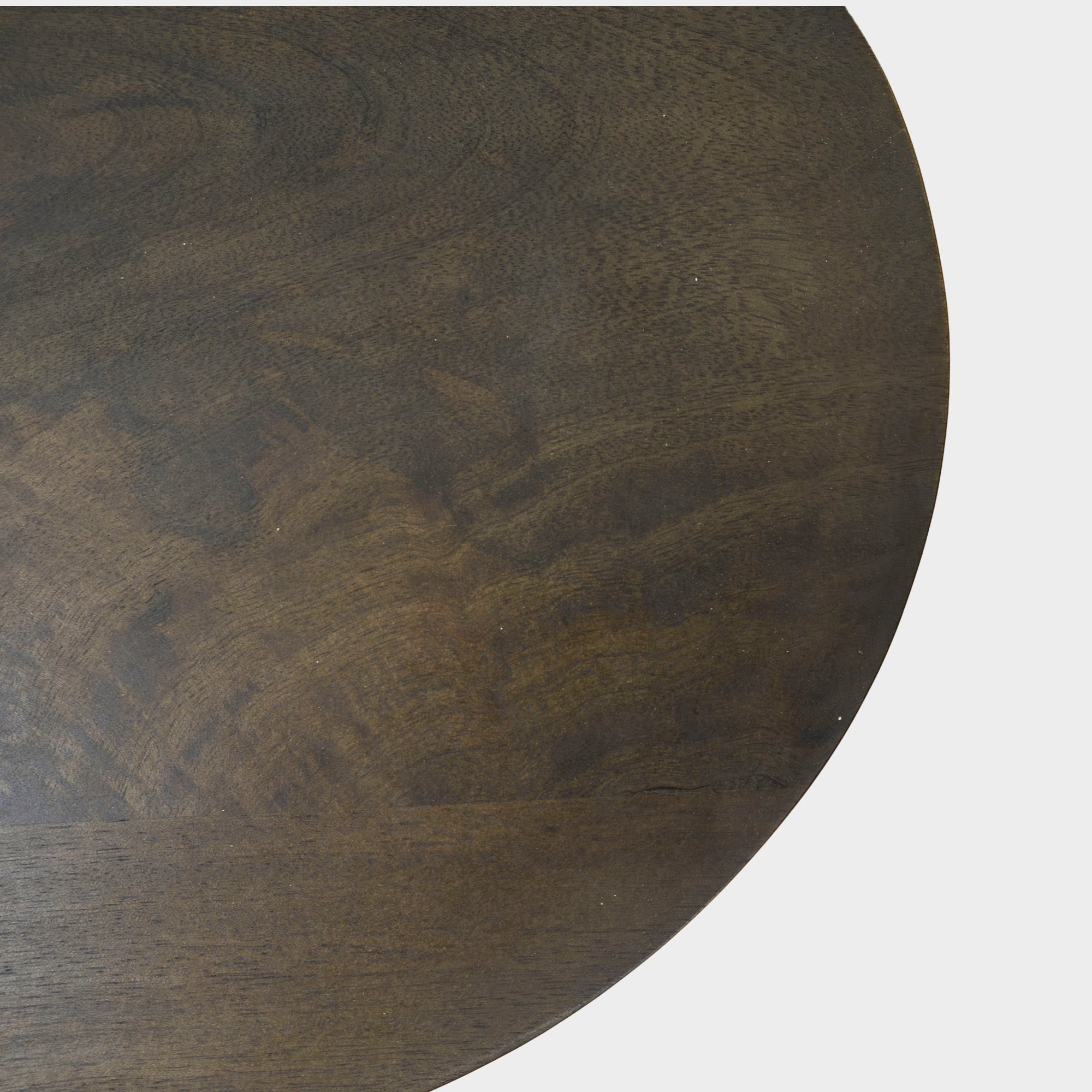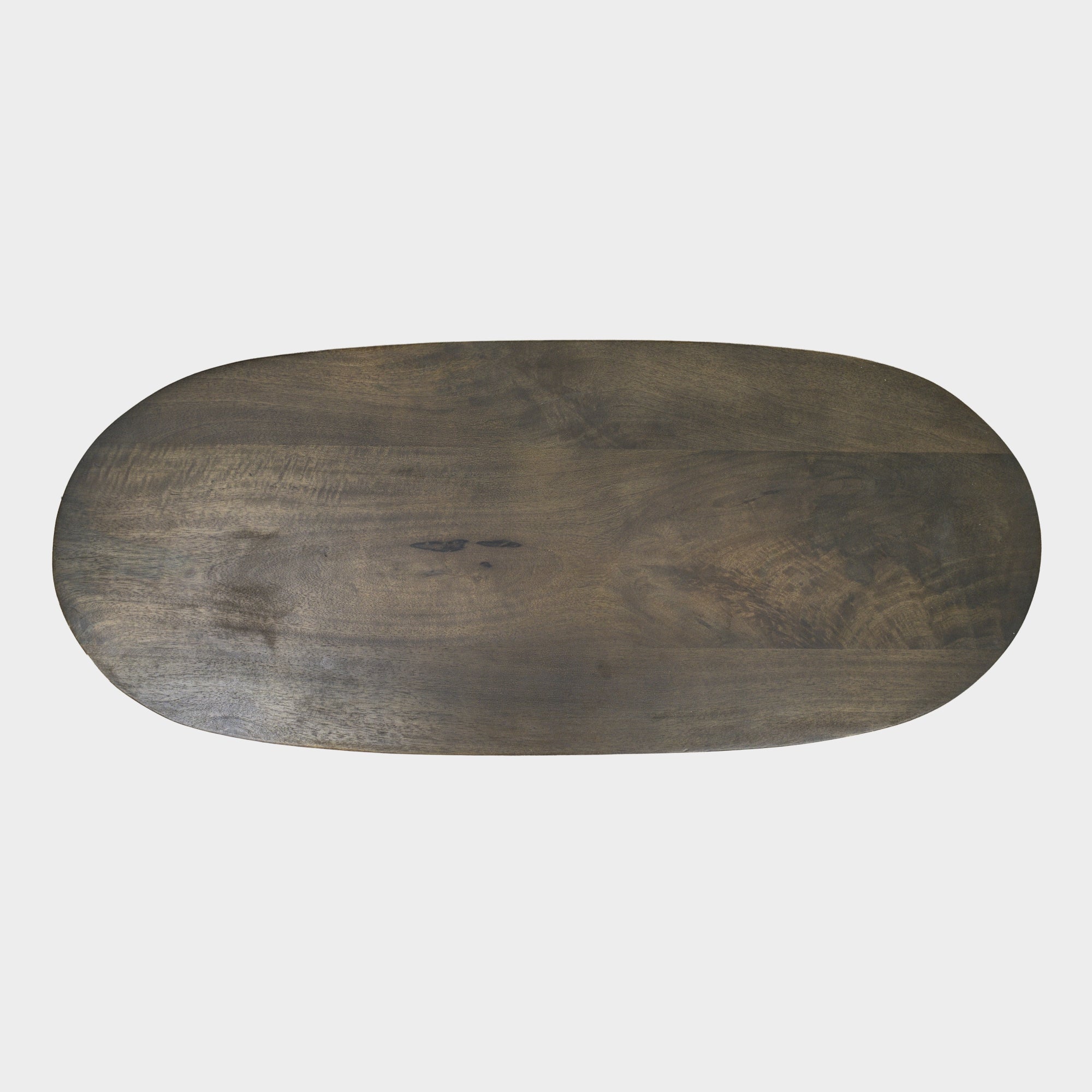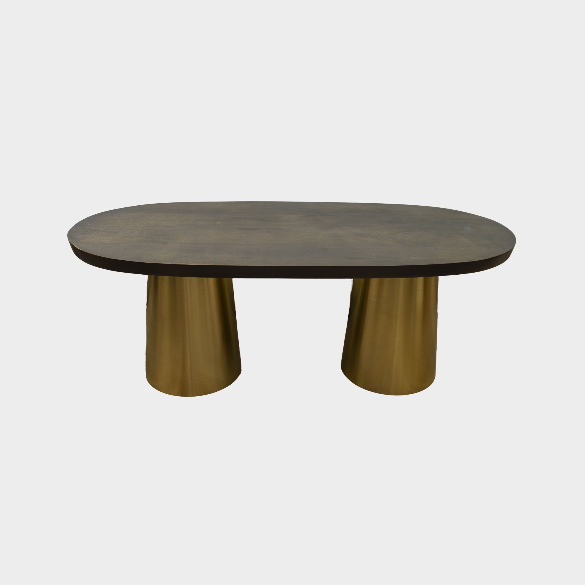 This coffee table features a smooth oval wooden top supported by two sturdy metal bases. The wooden surface brings warmth and natural character, while the metal base provides strength and stability. The combination of wood and metal creates a balanced look that works well in modern and contemporary spaces.