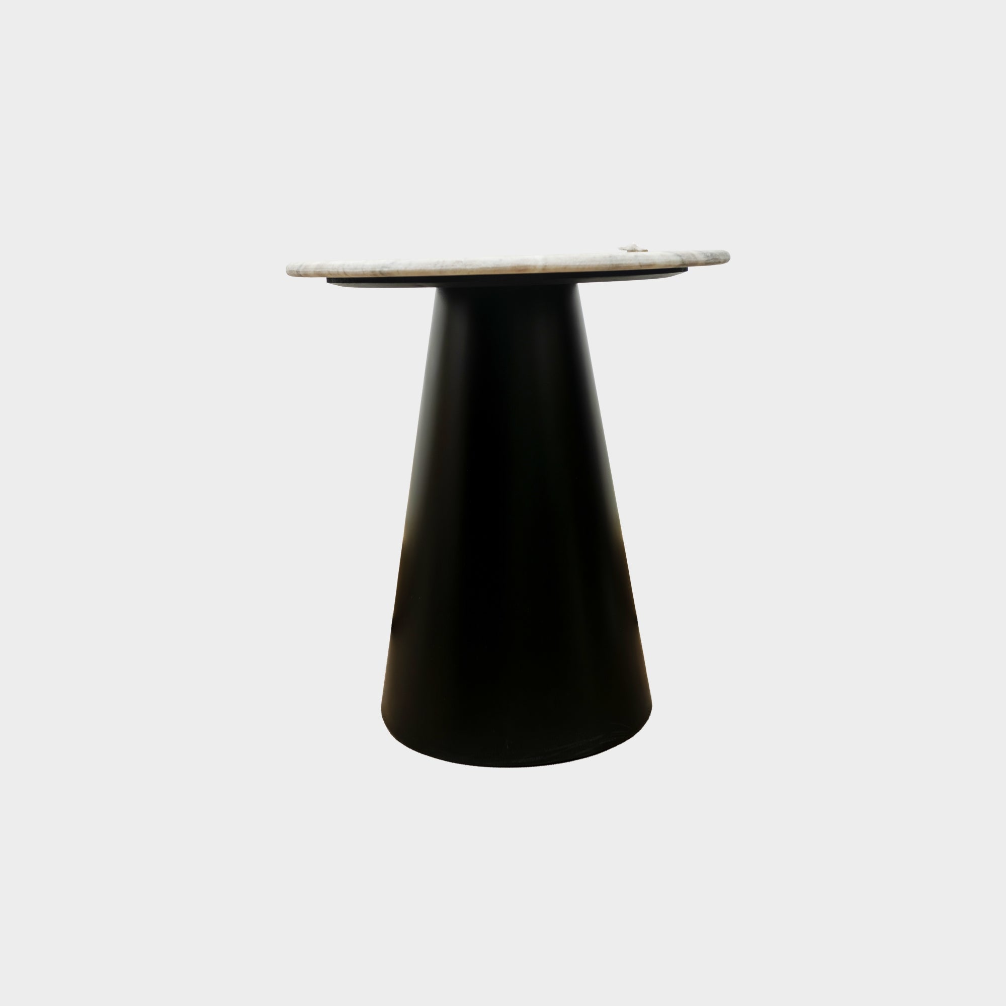 This side table features a smooth round marble top supported by a solid metal base. The natural marble surface displays subtle patterns, giving each table a unique look. The tapered metal base offers stability while maintaining a sleek and modern form.