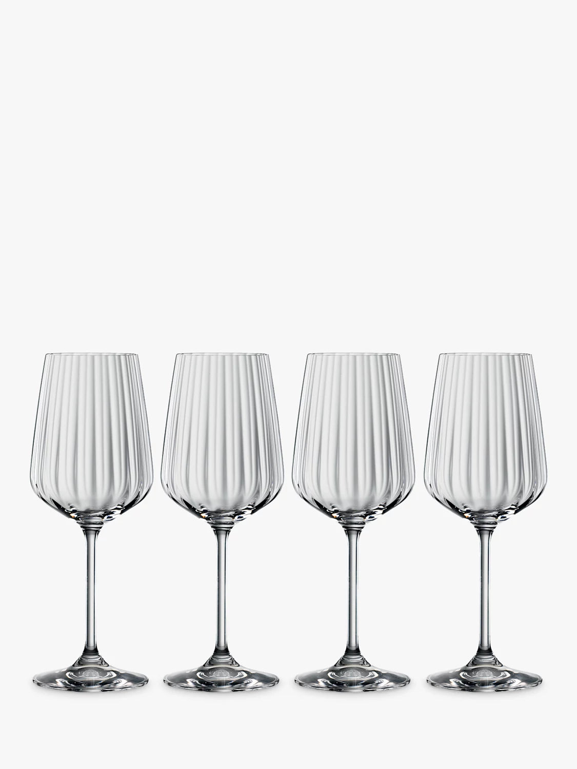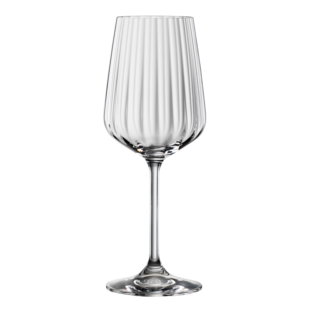 The SPIEGELAU LifeStyle White Wine glass is the ideal companion for your favorite whites, releasing their aromas and perfecting their balance of fruit and sweetness to create a perfect structure. With their modern diamond shape and linear decorations, these crystal glasses provide an eye-catching sparkle that adds a touch of glam to any tabletop!