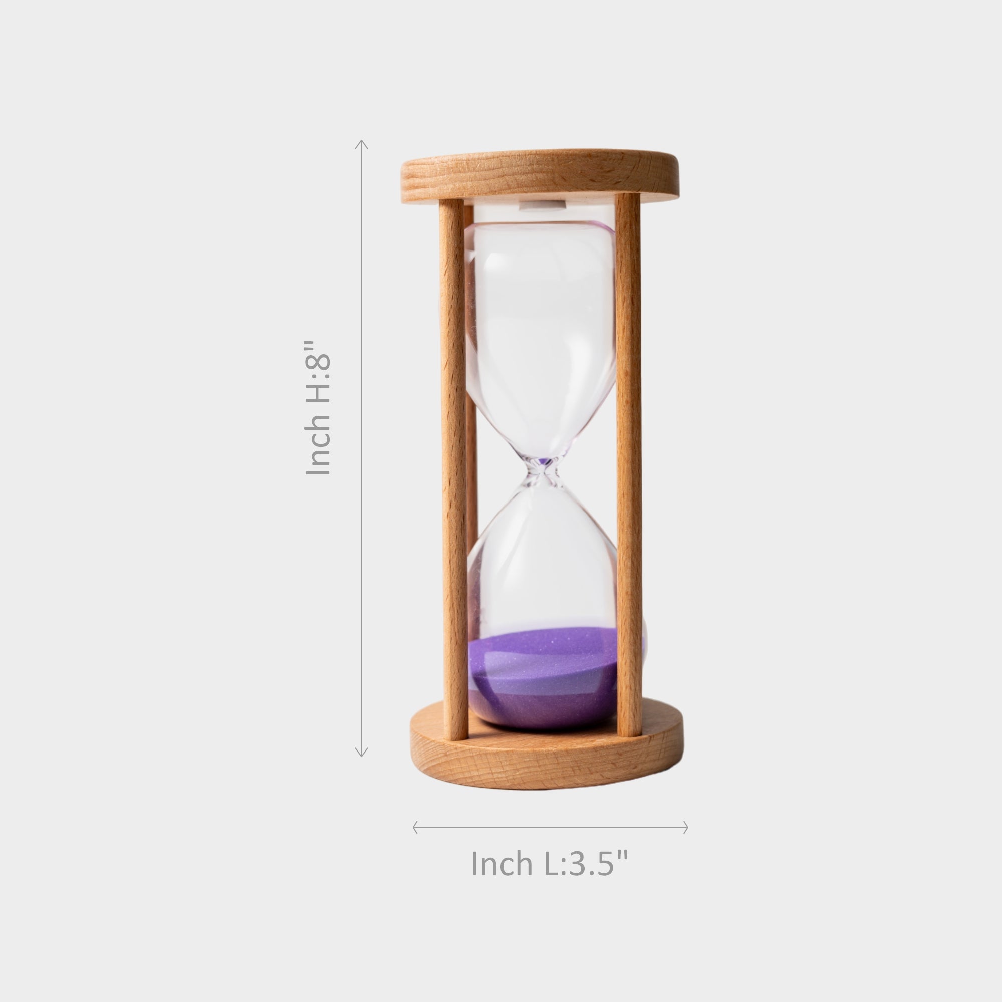 Designed with a clear glass body and smooth wooden frame, it features vibrant purple sand that