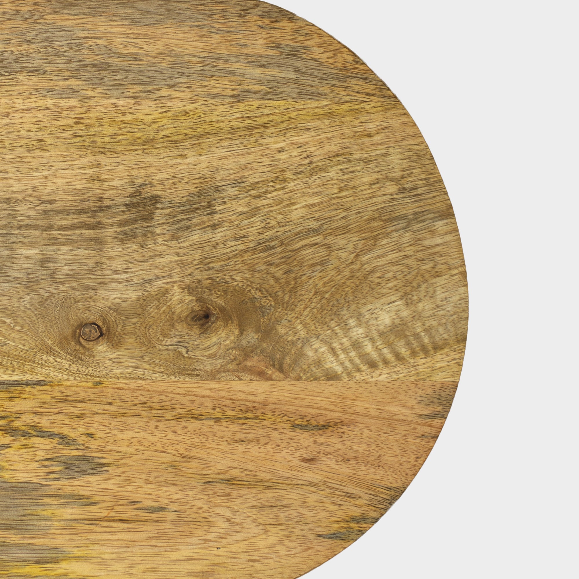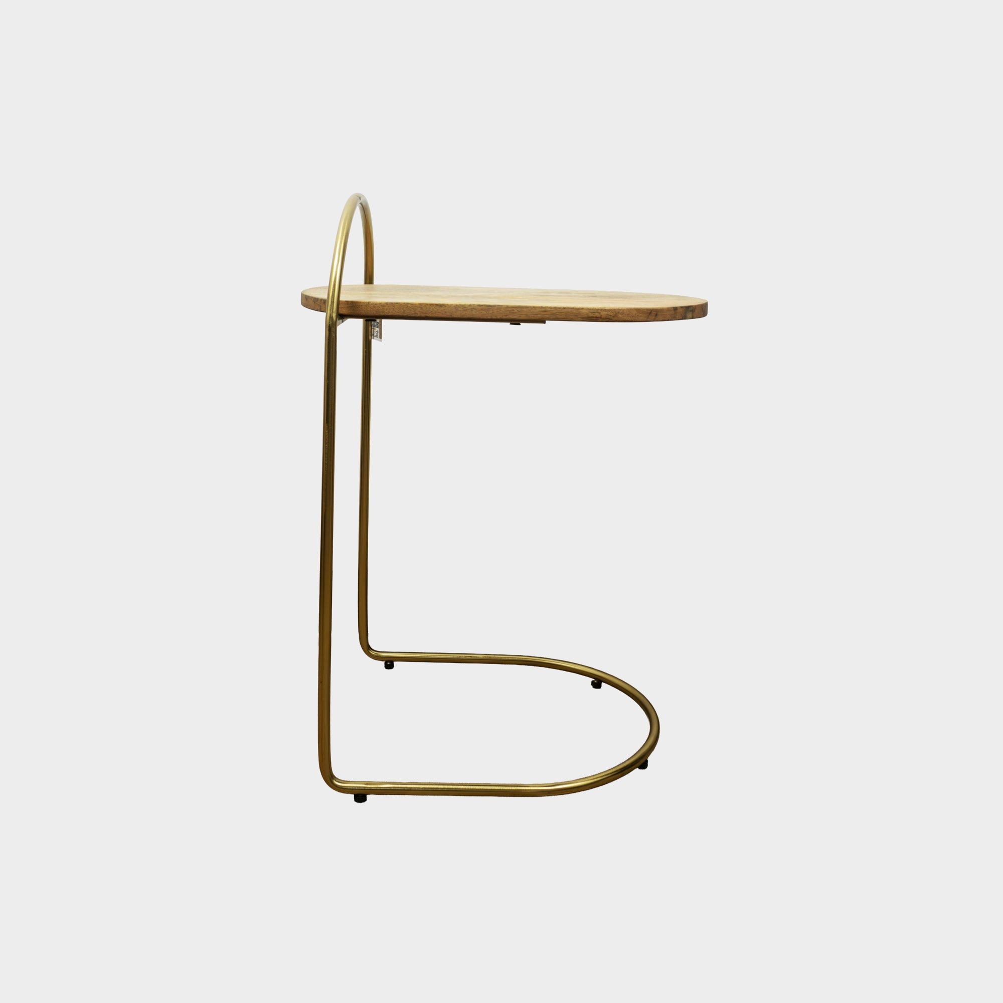 This C-shaped side table features a smooth wooden top supported by a sturdy metal frame. The curved metal base allows the table to slide easily under sofas or chairs, making it practical for everyday use. The natural wood surface brings warmth, while the metal structure provides stability and durability.