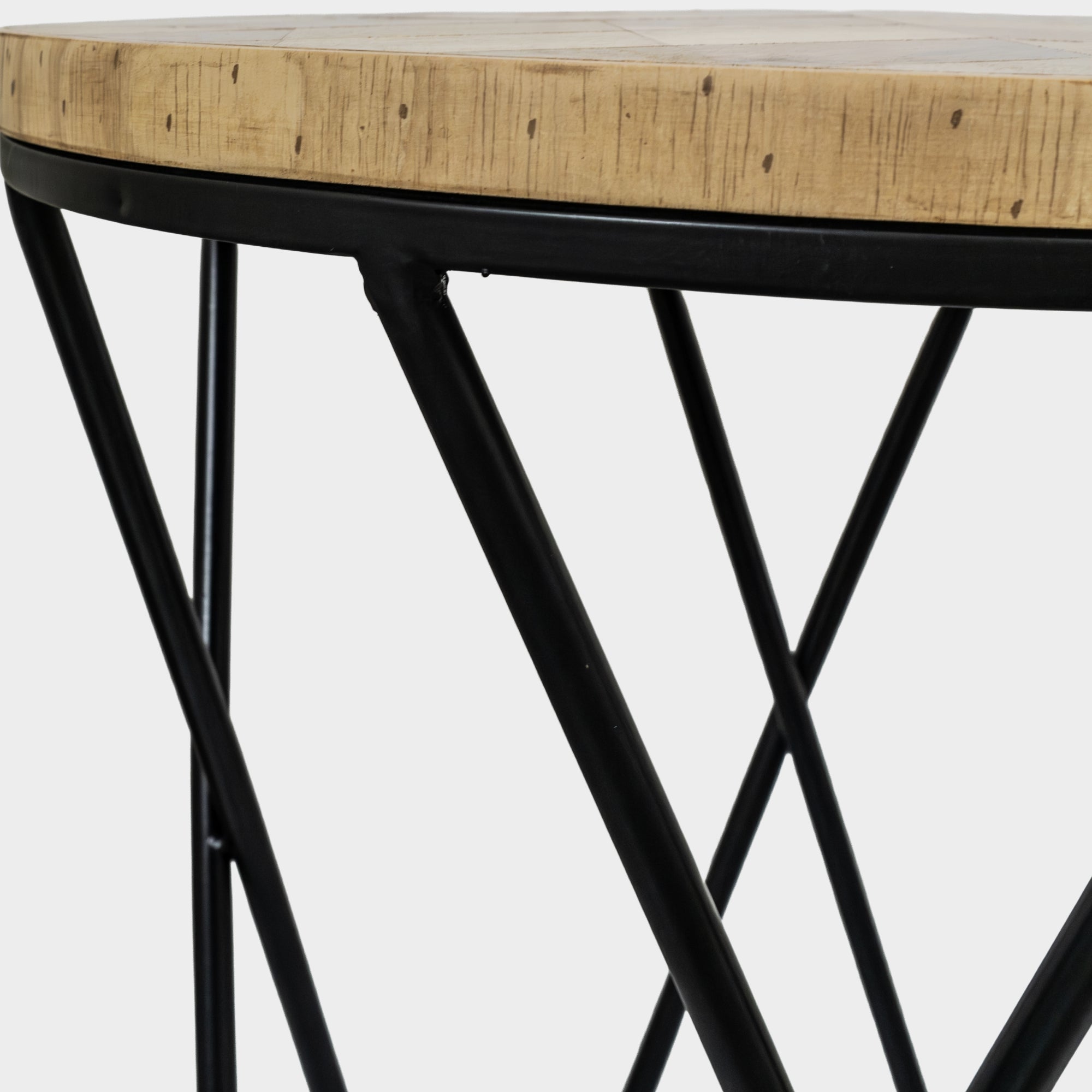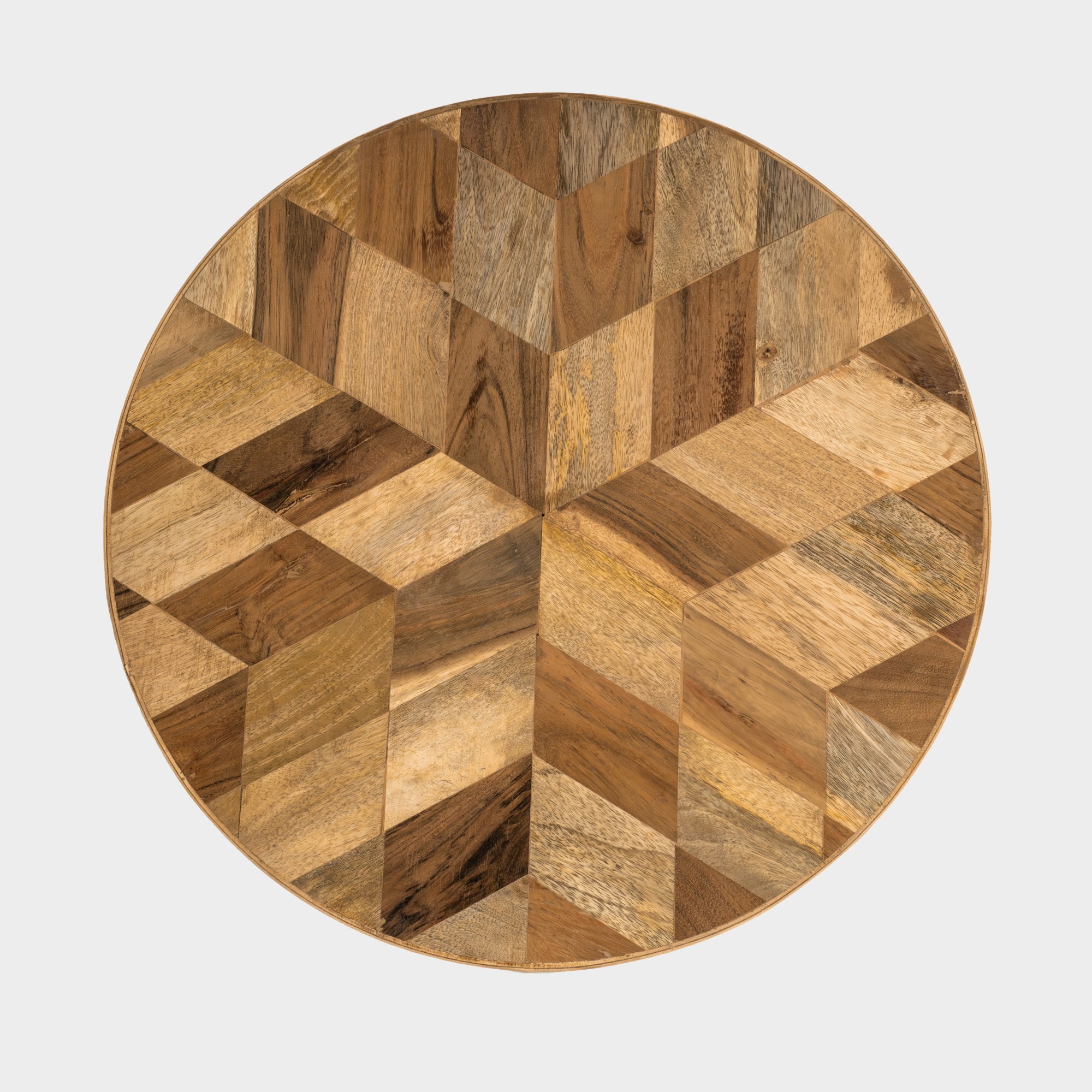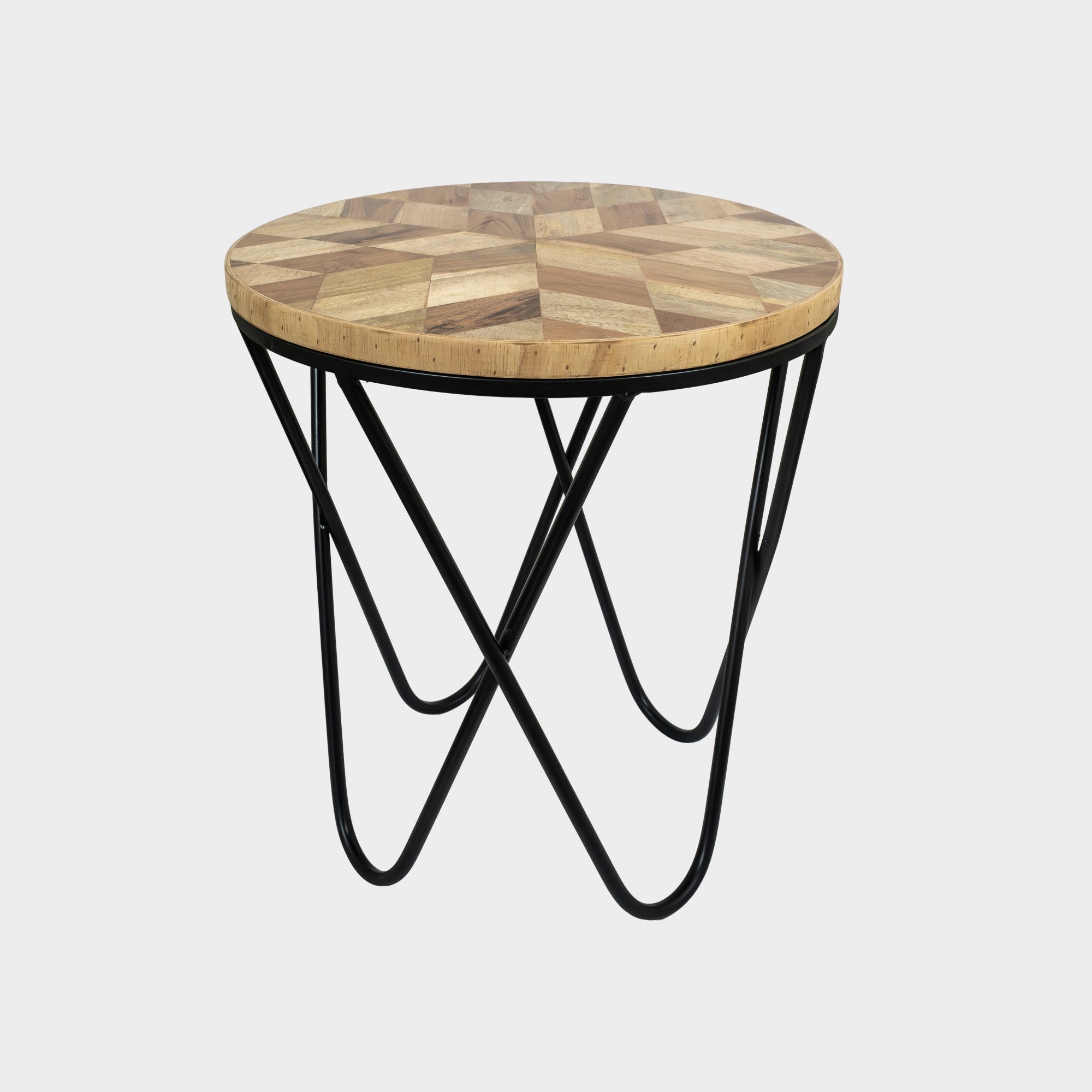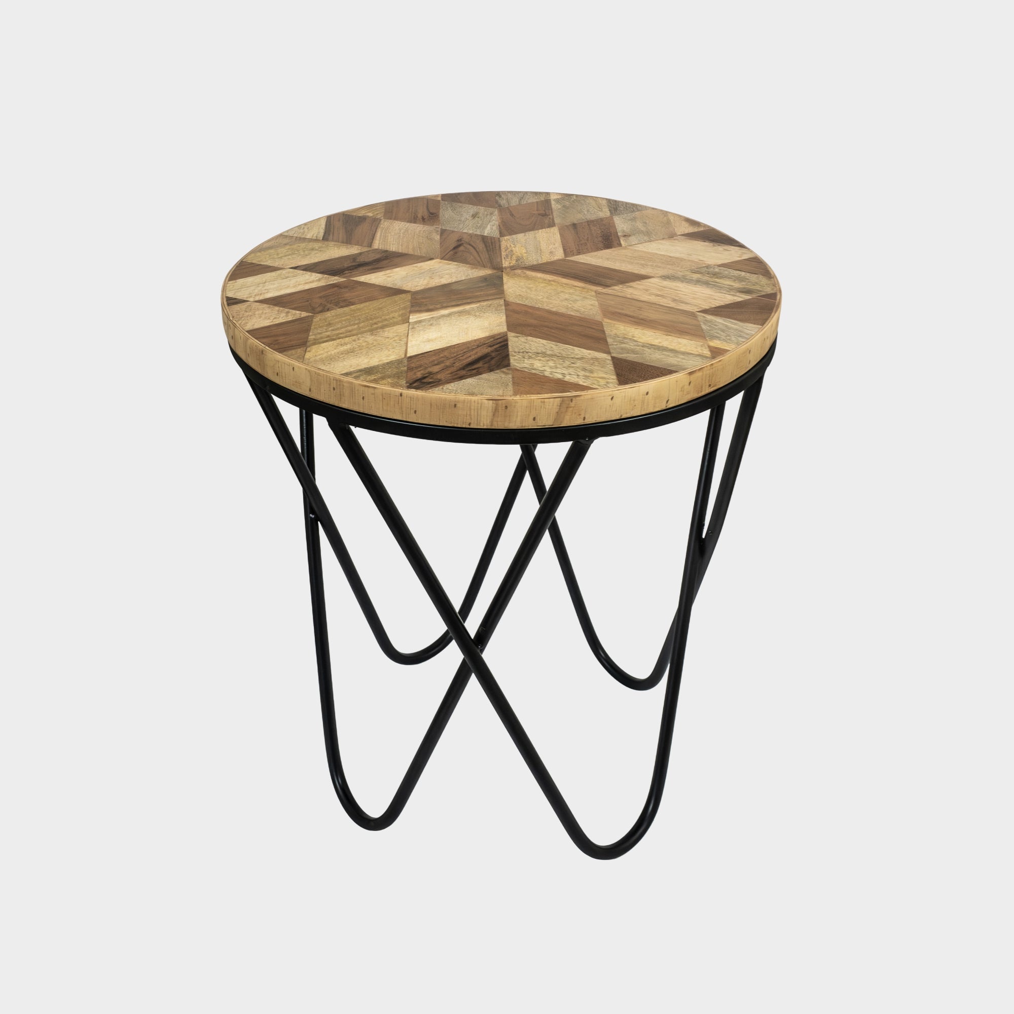 This side table features a beautifully crafted wooden top with a geometric pattern made from mixed wood tones. The natural grains and shades give it a warm, stylish, and earthy look that fits well in modern as well as classic interiors.